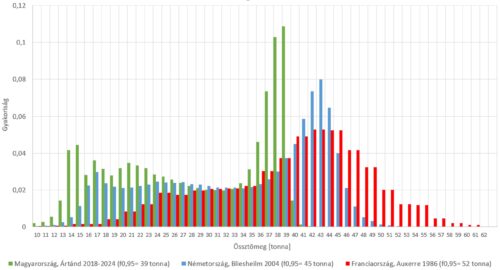 A magyarországi tehergépjármű mérlegelési adatokat bemutató résztanulmányban 5,5 millió mérési adat egyszerű statisztikai kiértékelése található. A magyar méréseket összehasonlítottuk az Eurocode hasznos járműterhének felvételéhez kapcsolódó franciaországi mérésekkel és a németországi nemzeti melléklet készítéséhez végzett mérésekkel is (3. ábra) [18].
